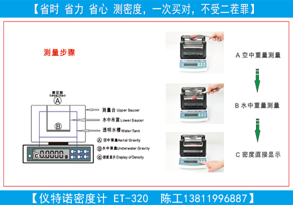 首先,測量樣品在空氣中的重量,并按下記憶鍵以保存數(shù)據(jù)。接著,將樣品放在水中測量臺上抗浮架的下方,待數(shù)值穩(wěn)定后再次按下記憶鍵。此時,電子密度計會自動顯示出該密度小于1的材料的密度值。