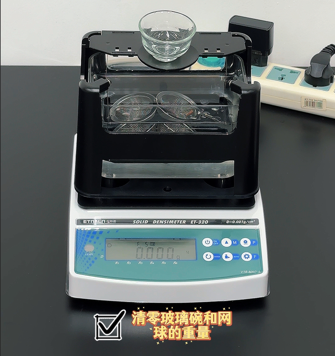 因?yàn)閱蝹€(gè)顆粒太輕,我們沒(méi)法只取一顆來(lái)測(cè)試,所以需要配套使用玻璃碗和網(wǎng)球(儀器標(biāo)準(zhǔn)配置里都有含有測(cè)顆粒的配件、測(cè)浮體配件)。