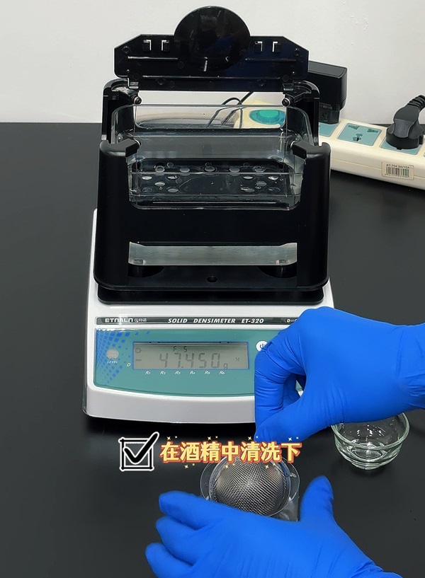 3、將盛有顆粒樣品的玻璃碗取下來(lái),將水中測(cè)量臺(tái)上的網(wǎng)球拿出來(lái),并把樣品倒入到網(wǎng)球中扣上網(wǎng)球,這時(shí)候需要注意樣品不能少,然后用手拿網(wǎng)球或鑷子夾起網(wǎng)球在事先準(zhǔn)備好的酒精中清洗一下,稍微用力抖動(dòng)確保顆粒間無(wú)氣泡。